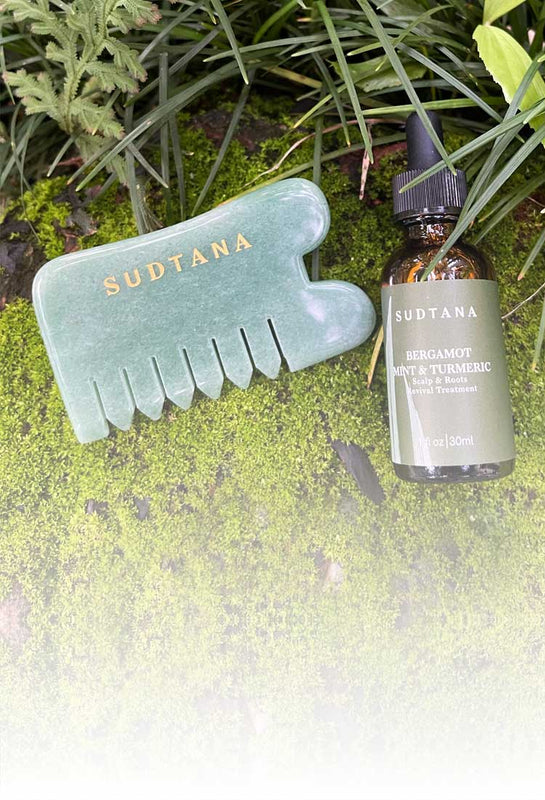 - Using the mouth side of our green aventurine Gua Sha comb: make long gentle strokes across your hair and scalp. Start from the middle of your head and go down the sides until you go all around your scalp.