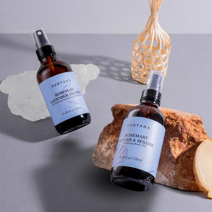 Our rosemary-based duo: a deeply hydrating all-natural body oil and our uplifting spray deodorant.